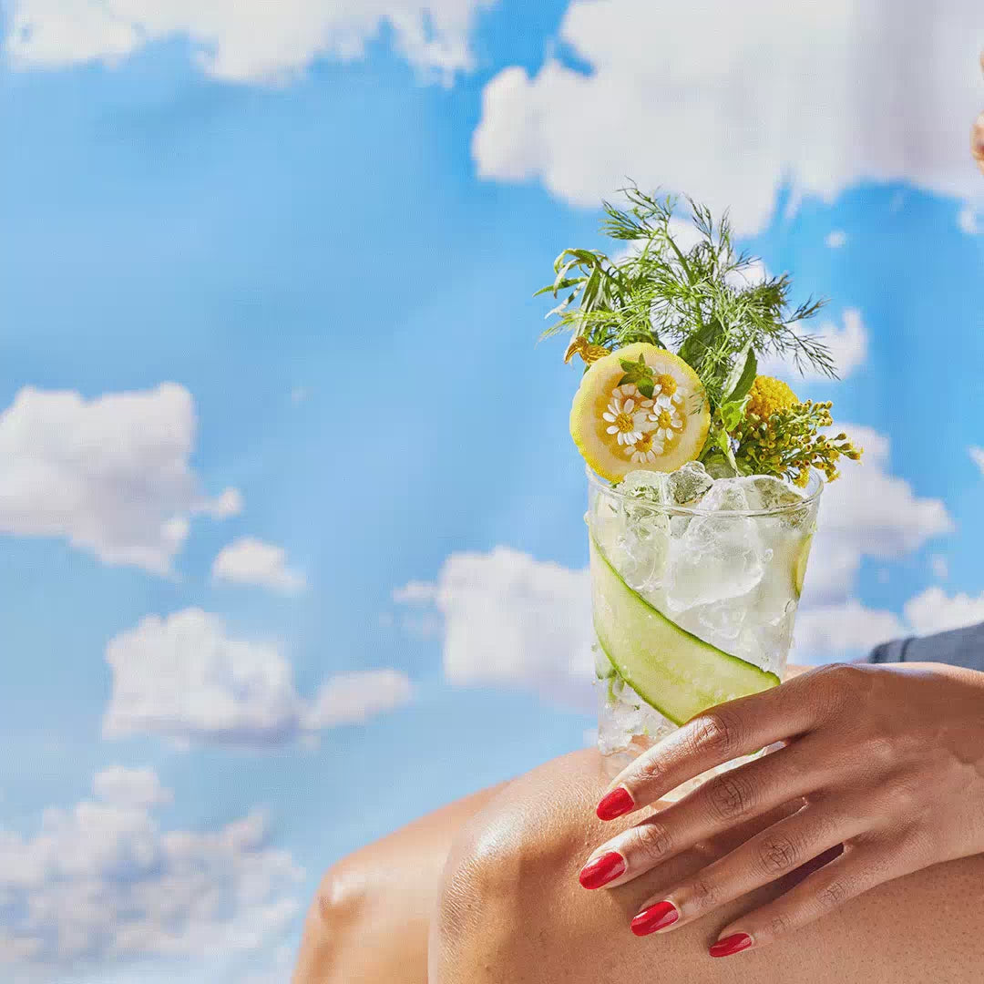 Beautiful booze-free blend of lemon, cucumber, alpine flowers, herbs, and ashwagandha to help you de-stress